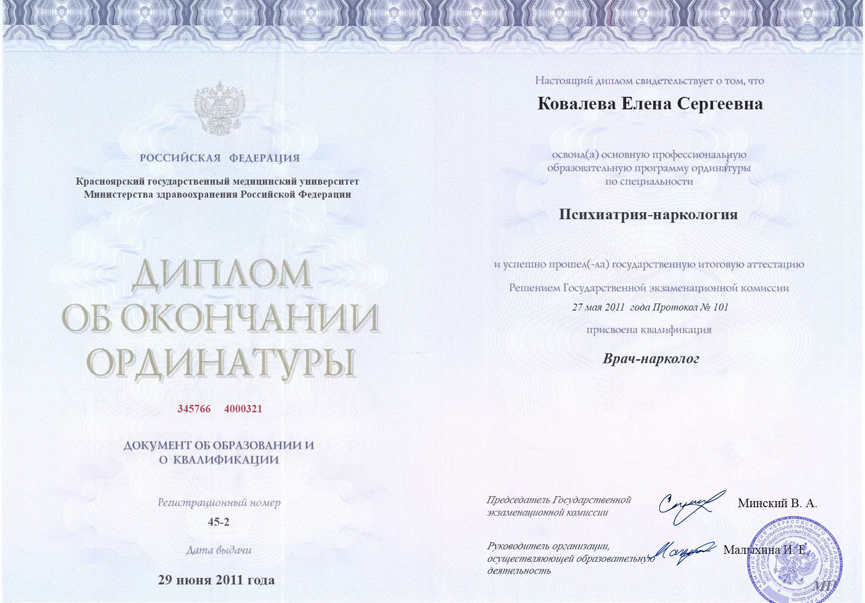 - Переподготовка и повышение квалификации в Красноярском государственном медицинском университете по направлению лечения зависимостей от химических веществ.